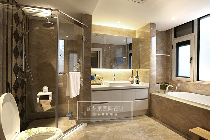 卫浴空间最见主人对品质生活的需求,每个物品都体现审美与情趣,良好的干湿分区,让洗浴更加方便,精致,透明的淋浴室,与装饰镜相映衬,令整个卫浴空间倍显通透明亮。